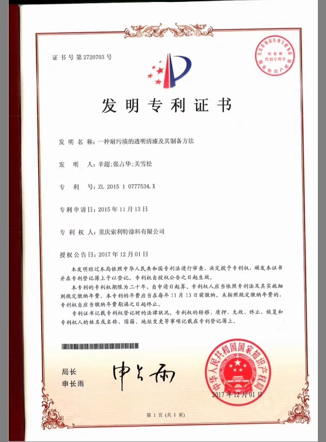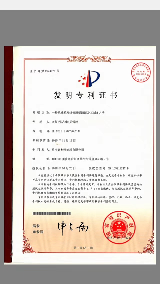 工作描述:2010年7月,进入重庆索利特新型建筑材料有限公司,任职技术总工。全面负责公司涂料产品的研发及技术管理工作。同月,独立开发厚(薄)浆型艺术料、幻彩系列质感涂料、水性液体壁纸、水性墙衣、岩片漆、水性多彩等艺术质感涂料。2011年6至8月,独立研发“弹性硅丙”高耐候真石漆;“有机硅”抗污真石罩面清漆;“高温核壳型”耐污外墙弹性面漆等新产品;独立研发“龙宝宝氧吧”净味5合1内墙乳胶漆;“茶清新”高效抗醛内墙乳胶漆;“雪滑白”净味全效内墙乳胶漆等新产品。并撰写该产品说明书及技术参数文案;2012年4月,独立研发“核壳型”水性金属漆;氟碳金属漆等新产品;独立研发“海藻龙”全效除醛内墙乳胶漆;并撰写该产品说明书及技术参数文案;2012年6月至9月,独立研发“变色龙”幻千调色外墙乳胶漆。2014年6月-2014年7月,研发设计索利特内外墙乳胶漆、真石漆、质感涂料及水包水多彩涂料产品,搜集相应原材料,研发出整套产品体系; 2014年8月,全套索利特产品送检合格; 2014年9月-11月,开发国家发明专利产品5项。《一种温感变色乳胶漆及其制备方法》、《一种水包水多彩涂料及其制备方法》、《一种除甲醛的内墙乳胶漆及其制备方法》、《一种具有调节室温功能的内墙乳胶漆及其制备方法》、《一种隔热保温涂料及其制备方法》;并在2015年进入专利实审阶段。http://www.soopat.com/Home/Result?SearchWord=%E9%87%8D%E5%BA%86%E7%B4%A2%E5%88%A9%E7%89%B9%E6%B6%82%E6%96%99&FMZL=Y&SYXX=Y&WGZL=Y&PatentIndex=0 2015年3月-5月,研发设计卡美伦内外墙乳胶漆渠道网络商品漆产品,搜集相应原材料,研发出整套产品体系; 2015年6月,全套卡美伦产品体系送检合格; 2015年10月-12月,开发国家发明专利产品5项。《一种耐污渍的白色乳胶漆及其制备方法》、《一种耐污渍的透明清漆及其制备方法》、《 一种抗涂鸦双组份白色乳胶漆及其制备方法》、《一种光感变色乳胶漆及其制备方法》、《一种抗涂鸦双组份透明清漆及其制备方法》;并在2016年初进入实审阶段。另开发公司设备相关辅助工具国家专利28项;以上5项发明专利分别于2017年12月1日和2018年6月26日授权,授权专利号为①ZL 2015 1 0779687.8《一种抗涂鸦双组份透明清漆及其制备方法》,②ZL 2015 1 0777534.X《一种耐污渍的透明清漆及其制备方法》(证书附件);http://www.soopat.com/Home/Result?Sort=&View=&Columns=&Valid=&Embed=&Db=&Ids=&FolderIds=&FolderId=&ImportPatentIndex=&Filter=&SearchWord=重庆卡美伦科技有限公司&FMZL=Y&SYXX=Y&WGZL=Y2016年3月-7月,研发水性工业漆产品。其中包括水性防锈漆、水性木器漆、玻璃漆及防腐。为适应市场的改变而做技术储备;